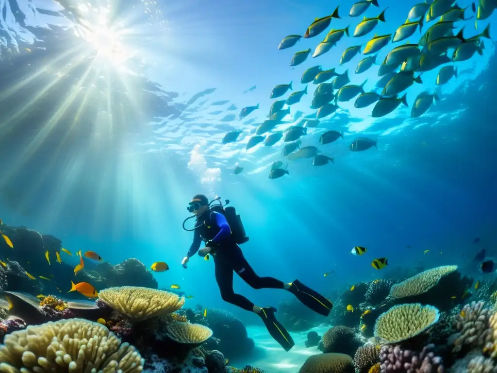 Imagen serena de buceo consciente en la costa de Australia, con corales vibrantes y peces coloridos bajo el cálido resplandor del sol
